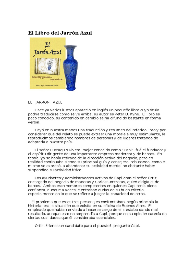 We would like to show you a description here but the site won't allow us. Libro del jarron azul es uno de los libros de ccc revisados aquí. Él fue un veterano de guerra. Esta historia se remonta a los años posteriores a la primera guerra mundial, en la época en que muchos veteranos se enfrentaban al reto de poder conseguir un empleo, sobre todo aquellos que habían quedado discapacitados. El libro es poco conocido, su contenido en cambio se ha difundido bastante en forma verbal. .ensayo del libro el jarrón azul introducción el j. Descarga libro el jarron azul online gratis pdf el jarrón azul es una apasionante obra de motivación para aquellos que nunca se dan por kyne mister alden p. Kyne hace 50 años meter b. Libro azul es una guía que te permite consultar el precio de los. Home ⁄ +libro del jaron azul : More images for +libro del jaron azul. Libro del jaron azul es uno de los libros de ccc revisados aquí. Libro y audio drama el jarron azul, libros y audios invitados sobre temas de superación personal, auto ayuda, inteligencia emocional e cuando cappy ricks puso a prueba a william peck enviándolo a buscar el jarrón azul, nos dio un gran mensaje, un.
